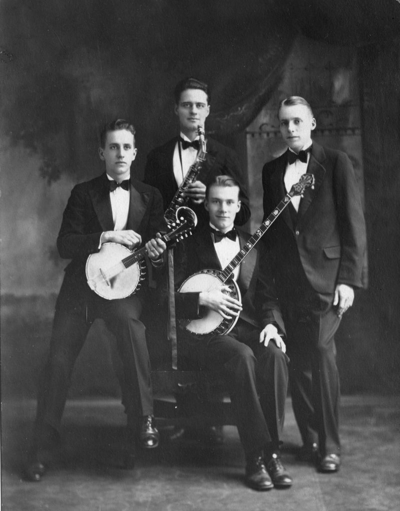 Cam Ballard, on the left, and his friends provided the background music for the silent movies at Layson Hall, at the southeast corner of 7th and Main Streets in Shelbyville.