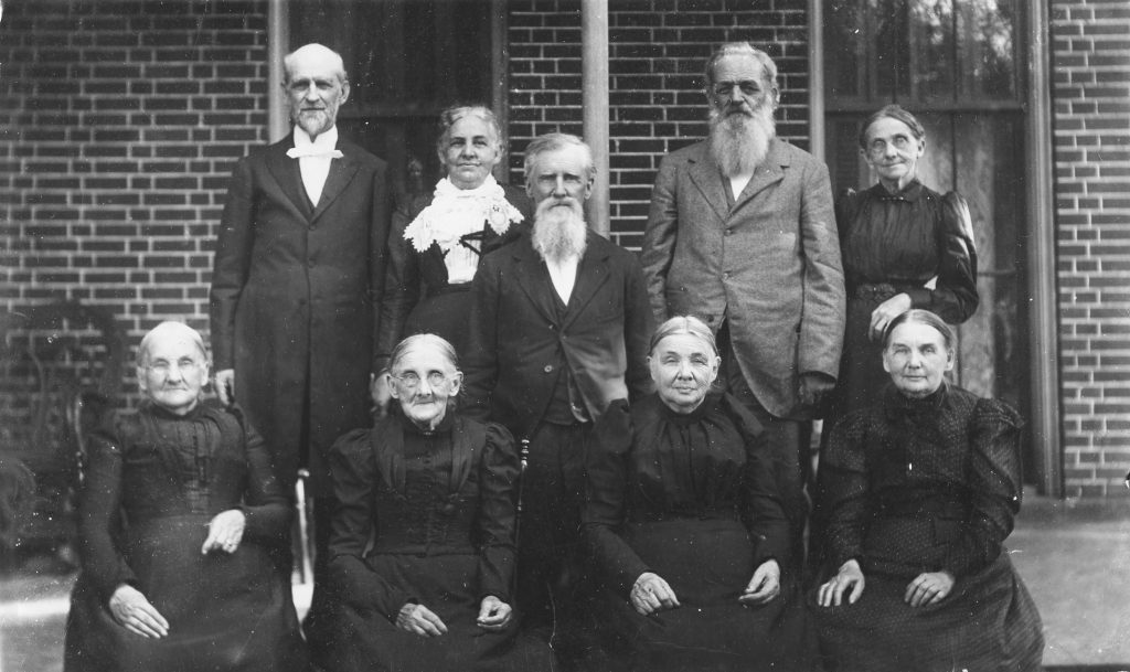Photographed is J. M. Hackworth with his six sisters. Sitting is Mrs. Elizabeth Logan, Mrs. Sue Hedden, Mrs. Maranda Barriger, and Mrs. Kate Ware. Standing Rev. and Mrs. (Helen) Jones, J. M. Hackworth, G. S. and Mrs. Amanda Wright.