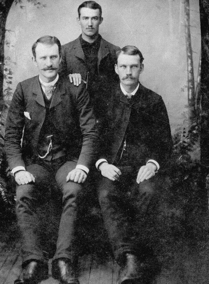 Sons of L. H. Gruber, sitting down on the left is Lynn Thomas Gruber and on the right is Henry Calvin Gruber. The man standing behind them is not identified.