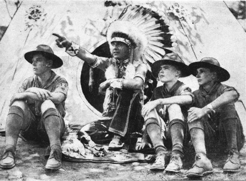 Scouts William L. Shannon, Angus Gordon, and Benton Miller listen attentively to an unidentified adult in 1931 at the Boy Scout Camp at Camp Covered Bridge.