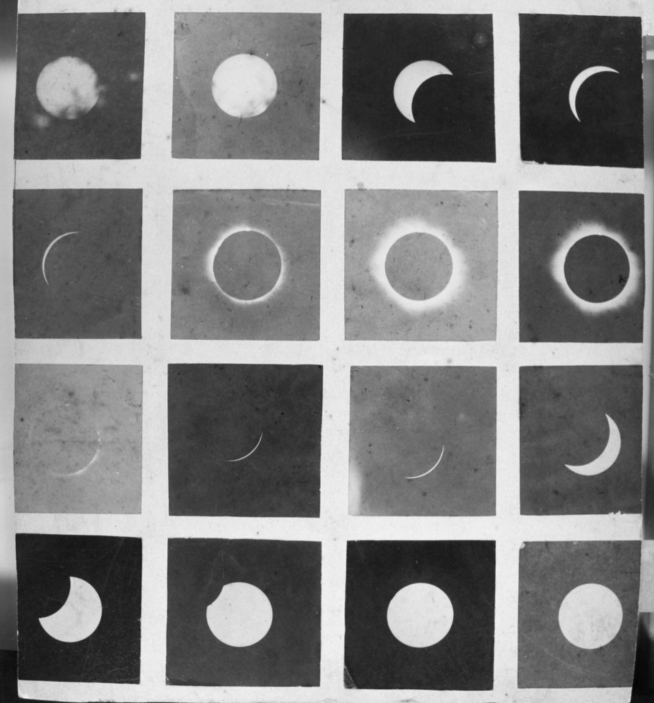 Set of photos displaying the progression of the total eclipse of the Sun that occurred on August 7, 1869.