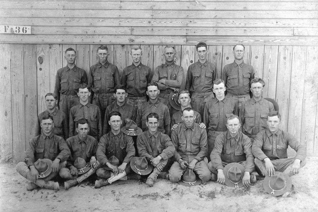 Taken in September of 1918 at Camp Mead in Maryland. Front row: Fred Harrington, Cecil Money, Judiah Gill, George E. Hanser, Caldwell Bird, Guy Duvall, and Edwin Coots. Second row: Salem Redman, Shelby Sharp, Walter Morgan, Roy McMullen, Herbert Neal, Horace Pearce, and Eddie Mullins. Back row: Roscoe Webb, Clay Cornelius, Davidson, William Ethington, Arthur Radcliff and Orval Florence.