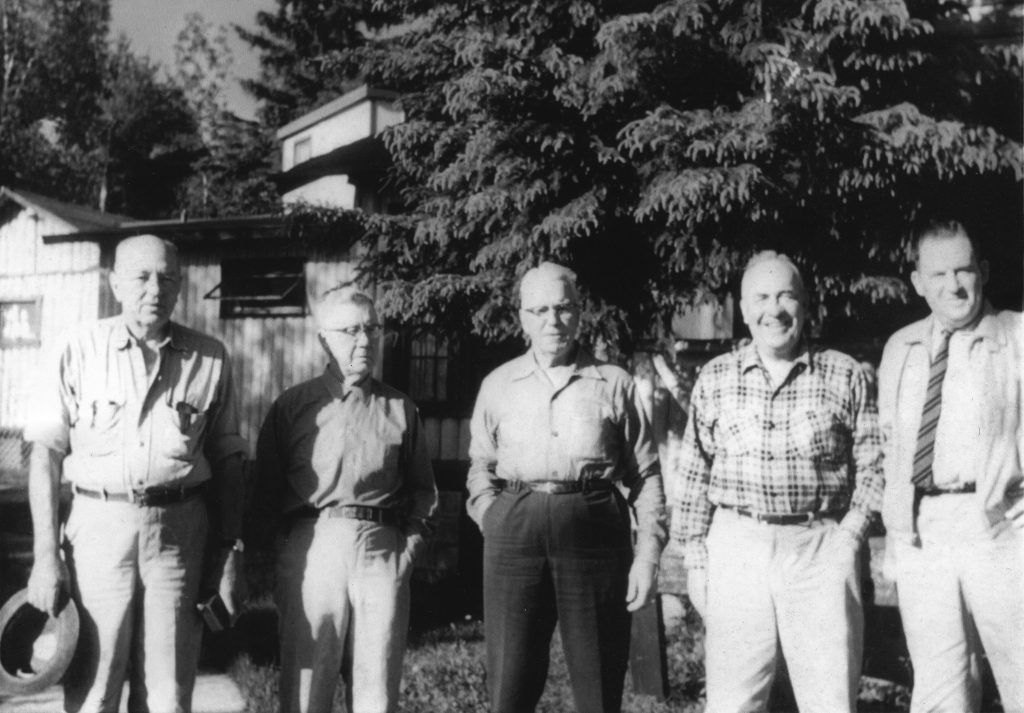 Enjoying a fishing trip in Curtain Falls, Canada in 1965 were, left to right, Robert M. Walters, Lindsey Logan, Paul F. Schmidt, Briggs Lawson, and Mark Scearce. Photographer was Fulton Smith.
