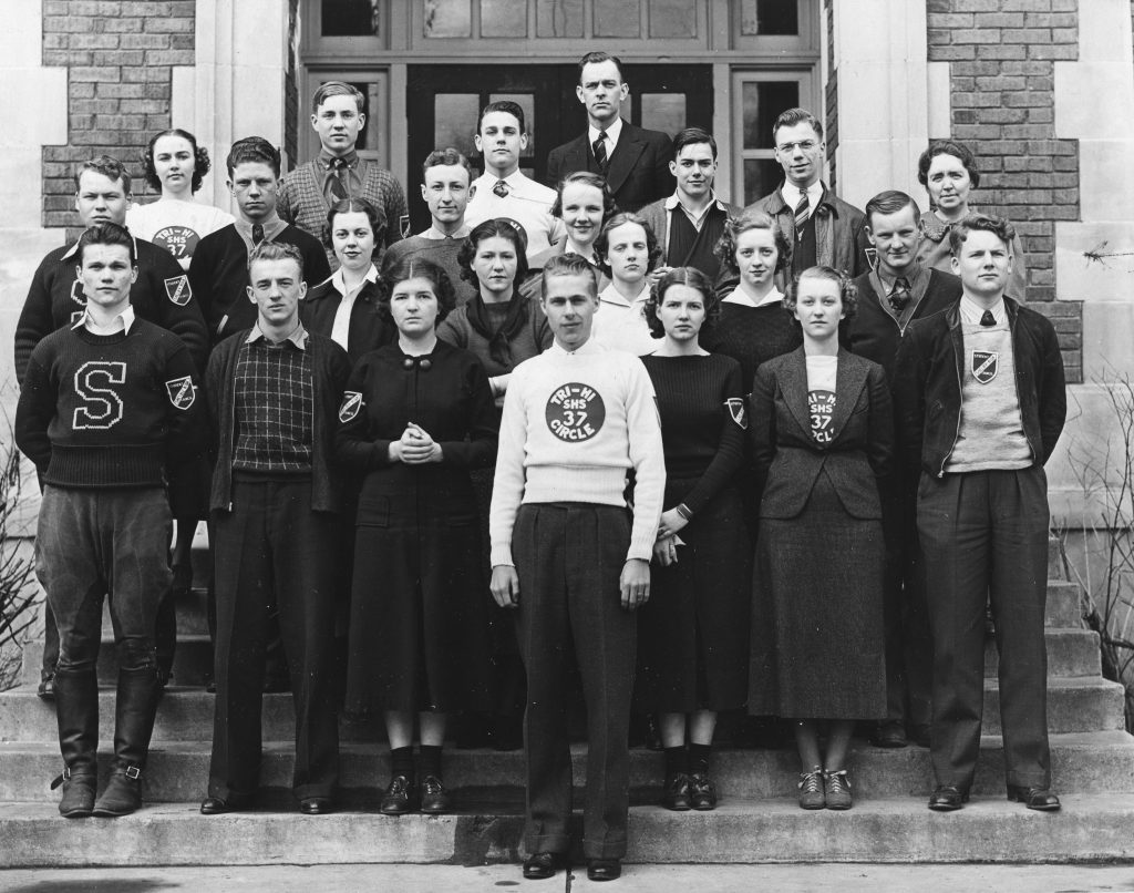 The Shelbyville High Student Council in 1937 was composed of Mr. Hankins and Miss Lewis as advisors. Officers are President, George Robinson; Vice-President, Bill Shannon; Secretary, Betsy Hanna; and Treasurer, Lillian Huss. Additional members are Peytie Ballard, Billy Chenault, Gilbert Ellis, Jessie Floyd, Sue Fullenwider, Eddie Hall, Virginia Hanna, Harvey Hanser, Vivian Harp, Anna Lee Hardesty, Johnny Milton, Ruth Porter, Julia Lee Scruggs, Ed Stratton, Ben Allen Thomas, Herman Whitaker, and Craig Schmidt.