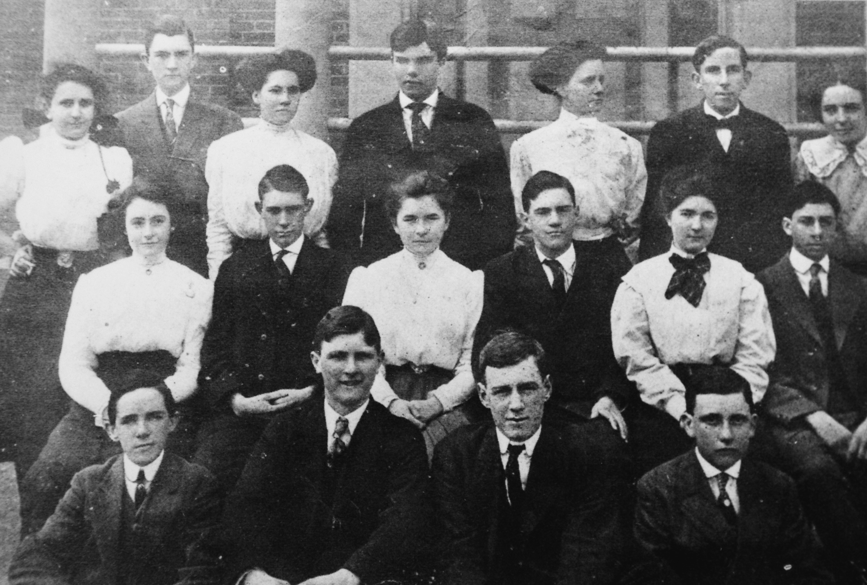 The sophomore class at Shelbyville High School in 1909 included left to right, front row, Bernard Bailey, Merritt James, Lewis Gruber, Theodore Band; second row, Virginia Boyd, Robert Brow, Julia Dale, J. J. Byars, Bessie Fawkes, L. D. Zaring; top row, Sylvia Sanders, Robert Smith, Della Heilman, Edwin Coots, Lucille Vannatta, Carl Smith, and Elizabeth Hansbrough.