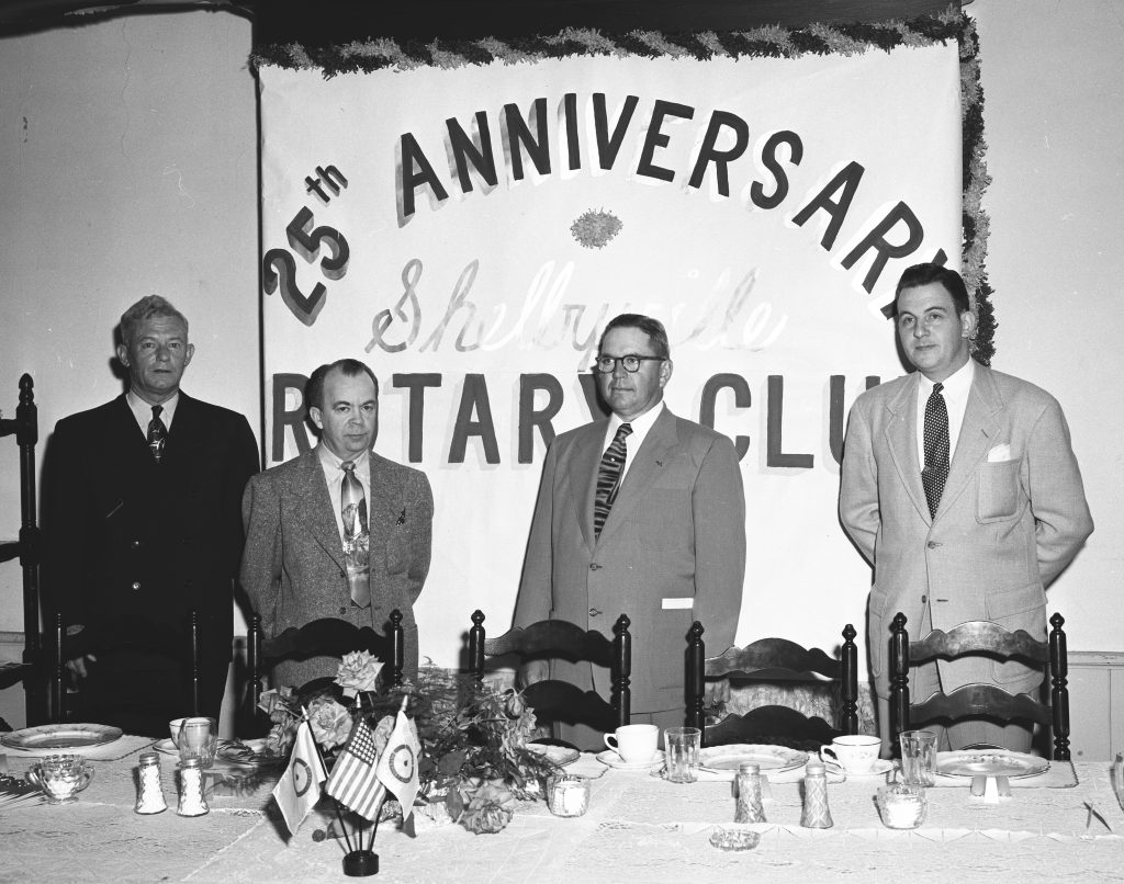The Shelbyville Rotary Club celebrated its 25th anniversary in 1952. On hand for the occasion were, unidentified person, longtime club secretary-treasurer Judge Coleman Wright, Horace Cleveland, and Mark Scearce.