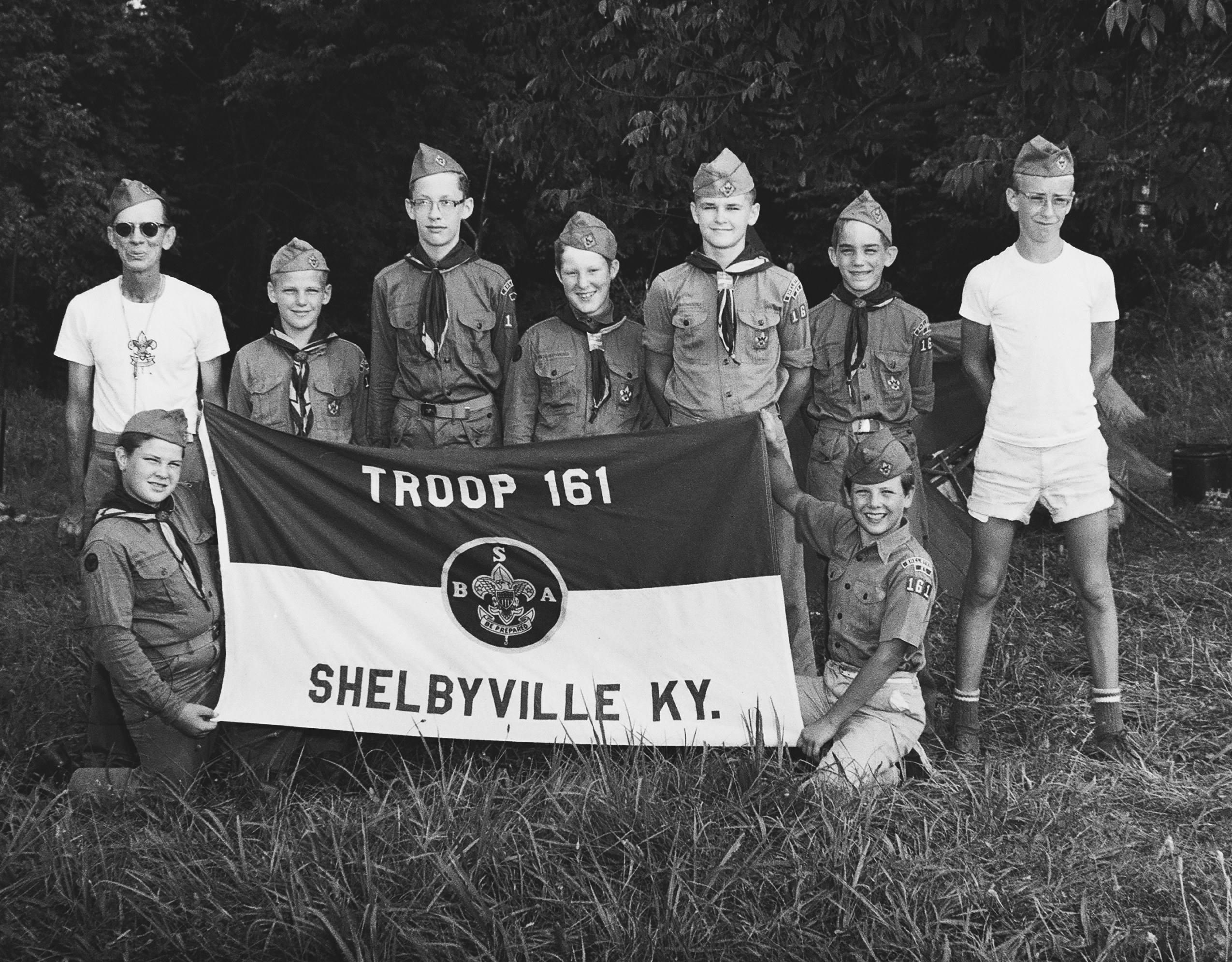 Rufus Harrod and his scout troop. Holding flag, left to right; Danny Hall and Buster Stanley; standing, left to right; Rufus Harrod, Benton Kinsolving, Virgil Wheeler, Johnny Hall, Roy Bailey, Melvin Layle Sams, Johnny Harrod.