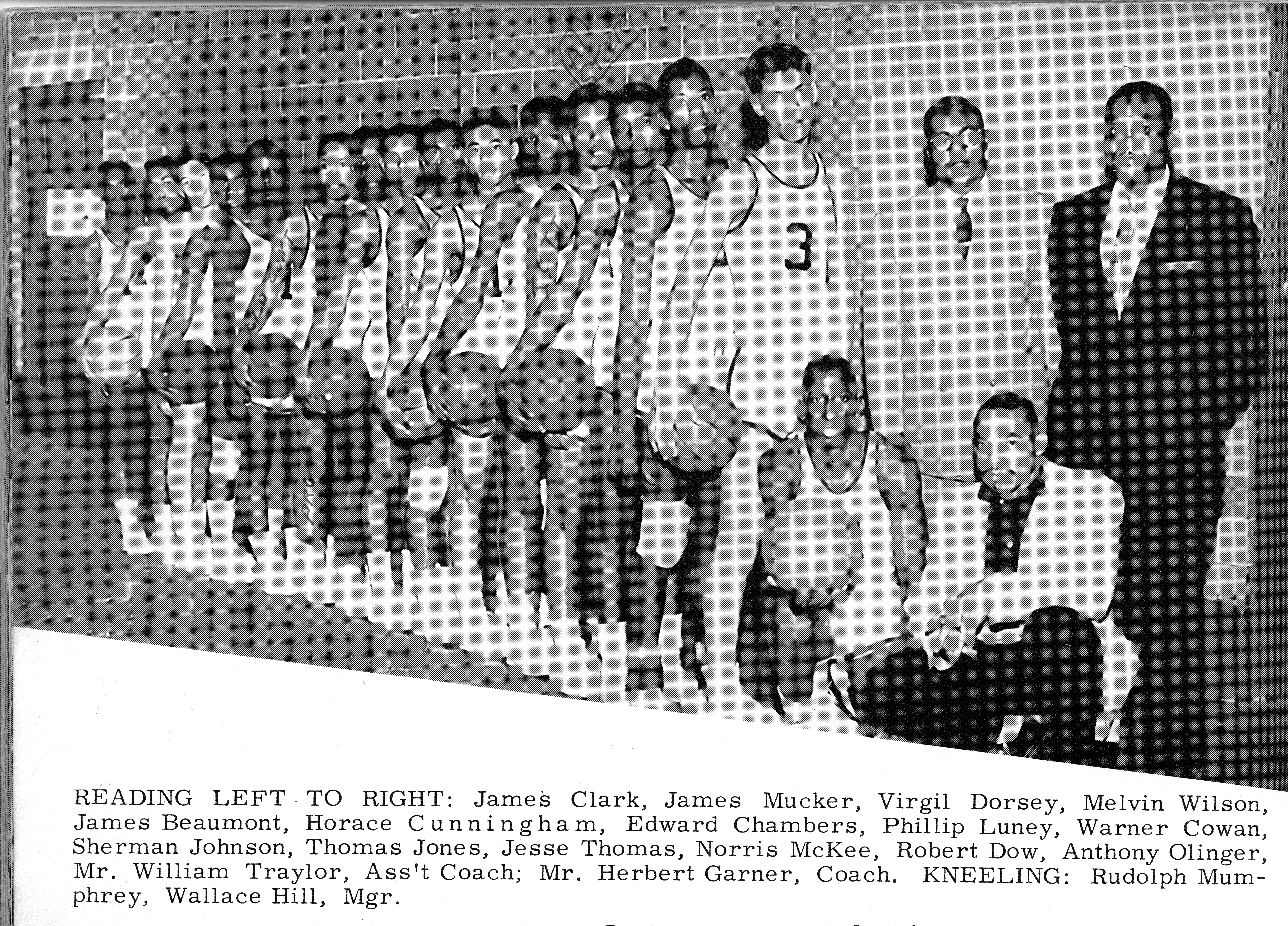 The Lincoln Institute basketball team of 1957 from left to right included, James Clark, James Mucker, Virgil Dorsey, Melvin Wilson, James Beaumont, Horace Cunningham, Edward Chambers, Phillip Luney, Warner Cowan, Sherman Johnson, Thomas Jones, Jesse Thomas, Norris McKee, Robert Dow, Anthony Olinger, Mr. William Traylor, Ass’t Coach; Mr. Herbert Garner, Coach. Kneeling: Rudolph Mumphrey, Wallace Hill, Mgr.