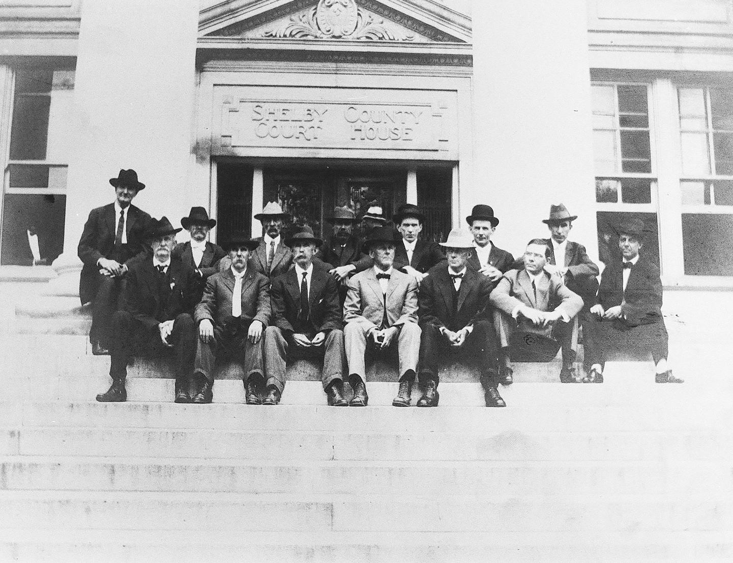 The convening of the first Grand Jury on Nov. 10, 1914, after the new courthouse was built brought this group together. From left to right in the upper row are Sam Newton, George Mahuron, Charles Jennings, W. C. Buckman, Robert McDowell, Robert Sleadd, County Attorney Edwin Davis, and Commonwealth’s Attorney Charles Sanford; seated, lower row, are John Fawkes, James Price, James Wright, Mr. Green, Mr. Crawford, and John E. Brown.