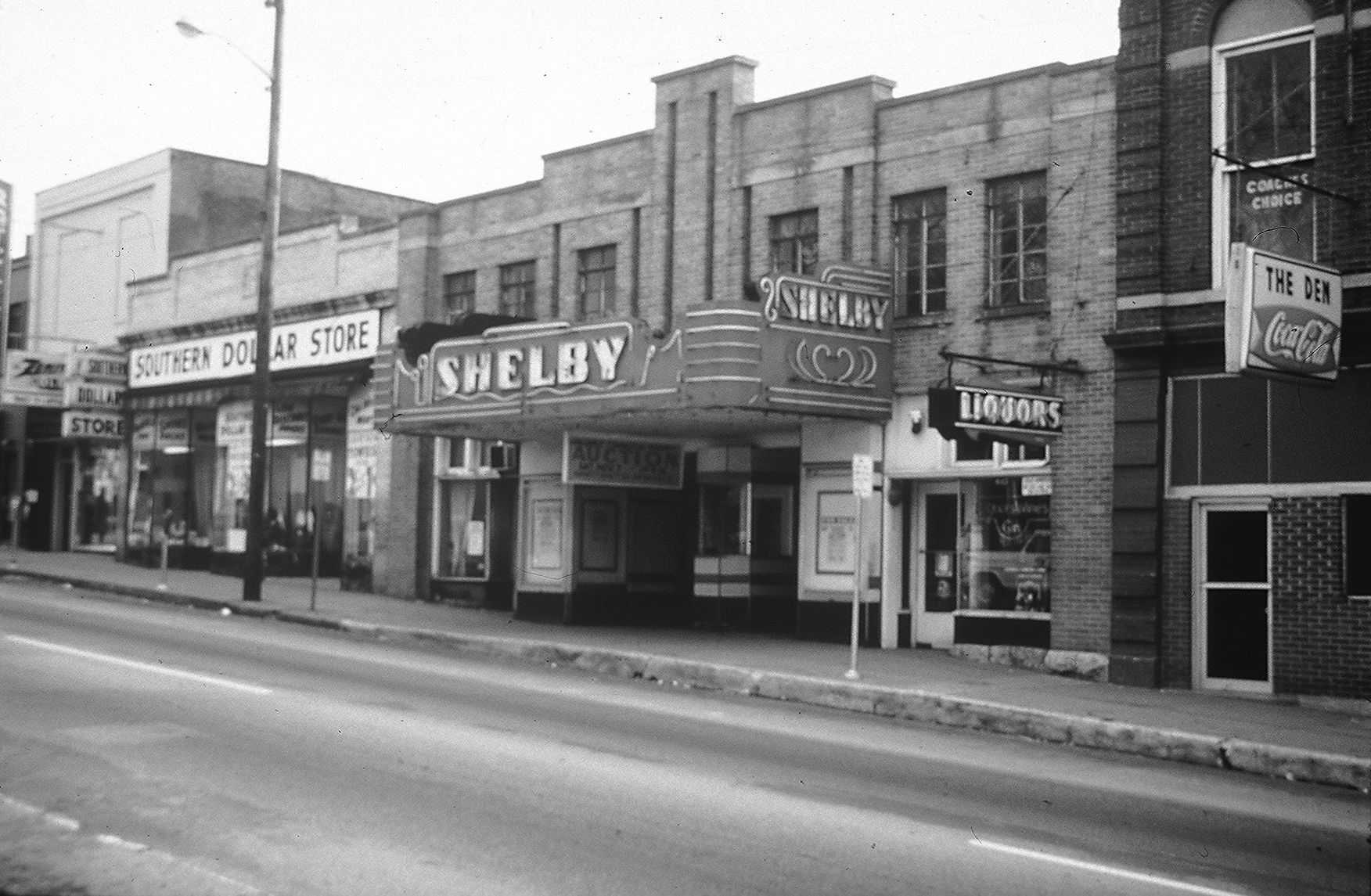 The Shelby Theatre was flanked by the Southern Dollar Store and a liquor store in 1960.
