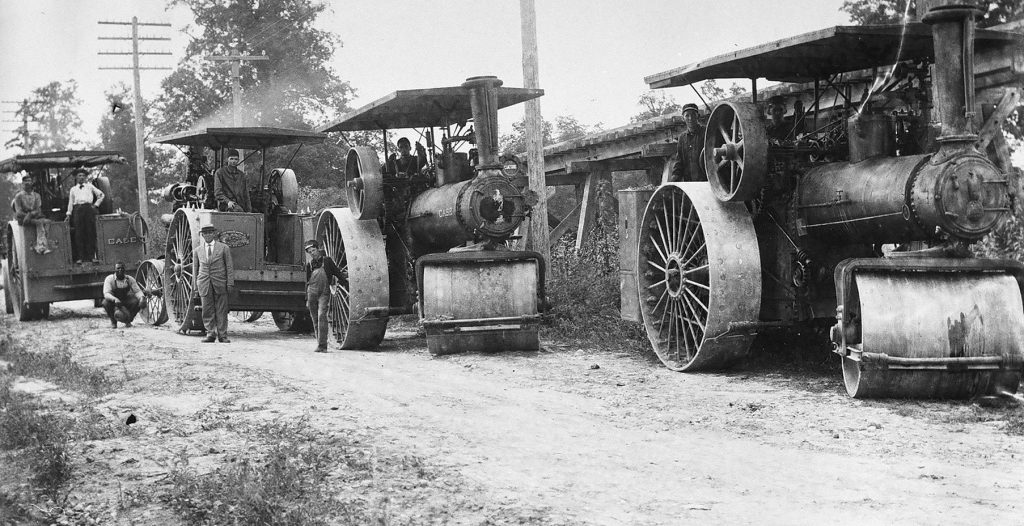 Road building machines were busy paving Shelby County roads around 1910.