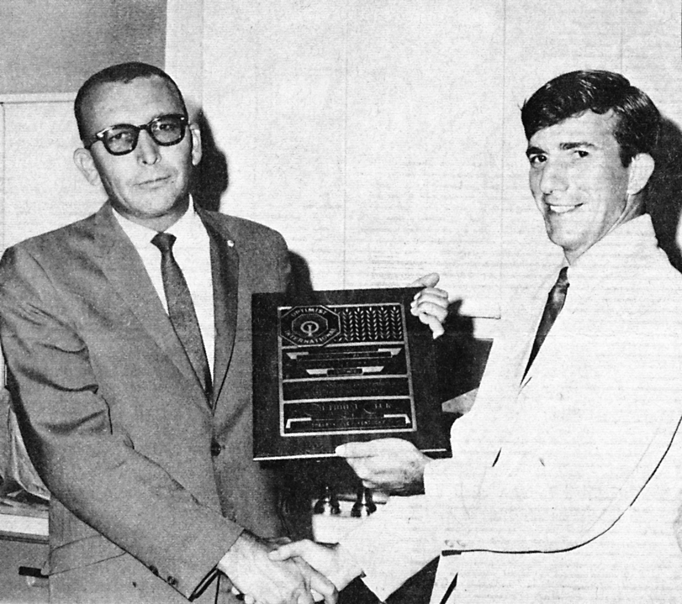 Howard Streible (on the right) presents the “Optimist of the Year” award to Harold Major, who also served as the Optimist club’s president.