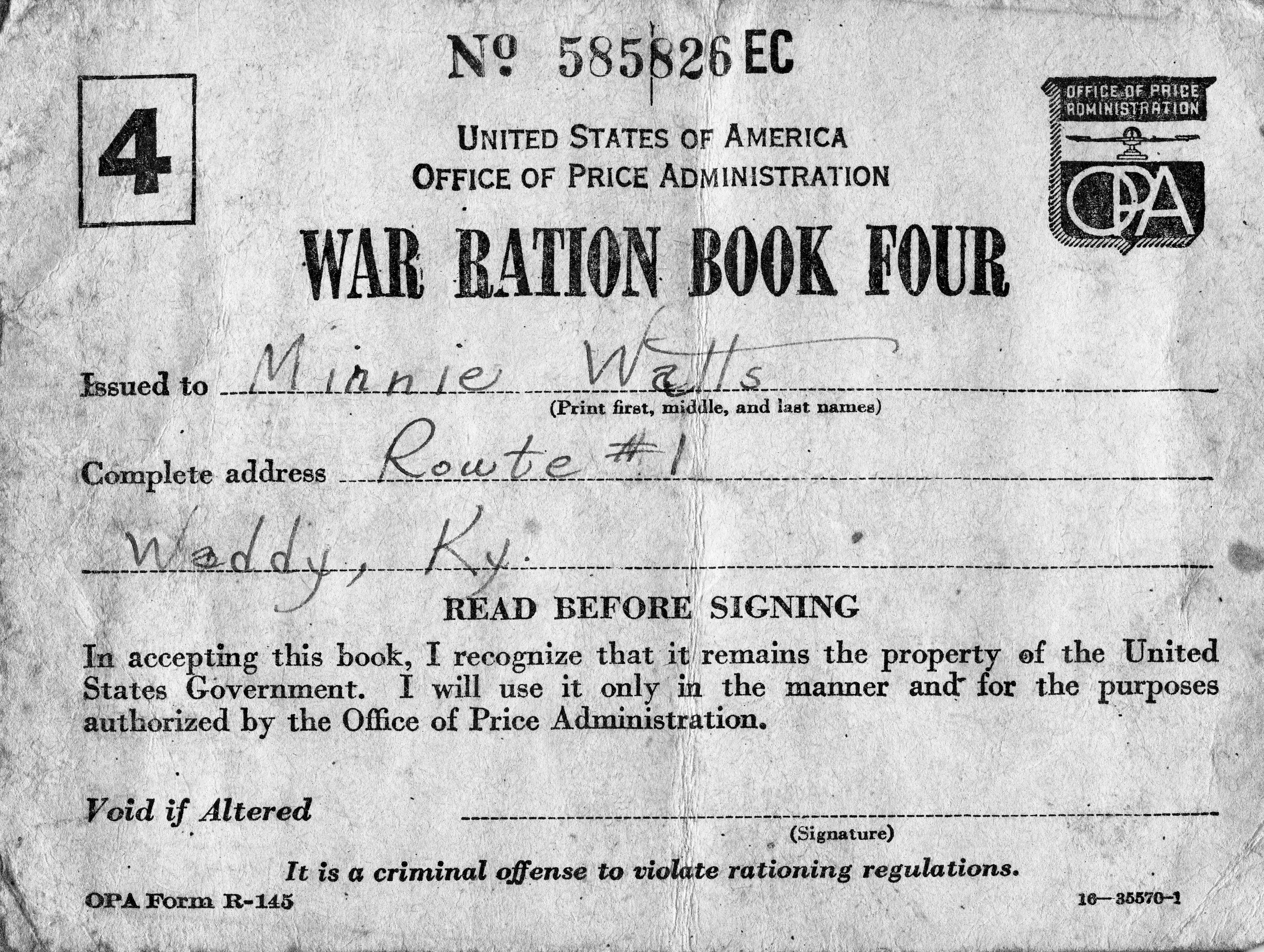 During World War II, nearly every home in Shelby County had a War Ration Book. This one was issued to Minnie Watts of Route 1, Waddy in 1943.