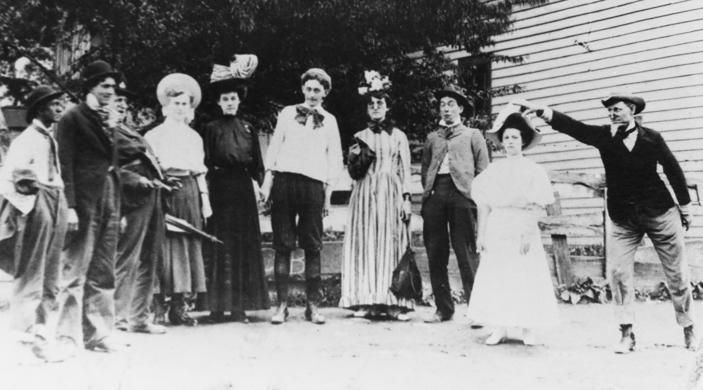 These actors in a play at Mt. Eden in the early 1900s include left to right; Henry G. Cleveland, Bill Kinder, Edgar Waters, Ruby Hardesty, Jim Hedden, Leola Harrison, Ottis Goodwin, Luella May, and O. H. Skyles.