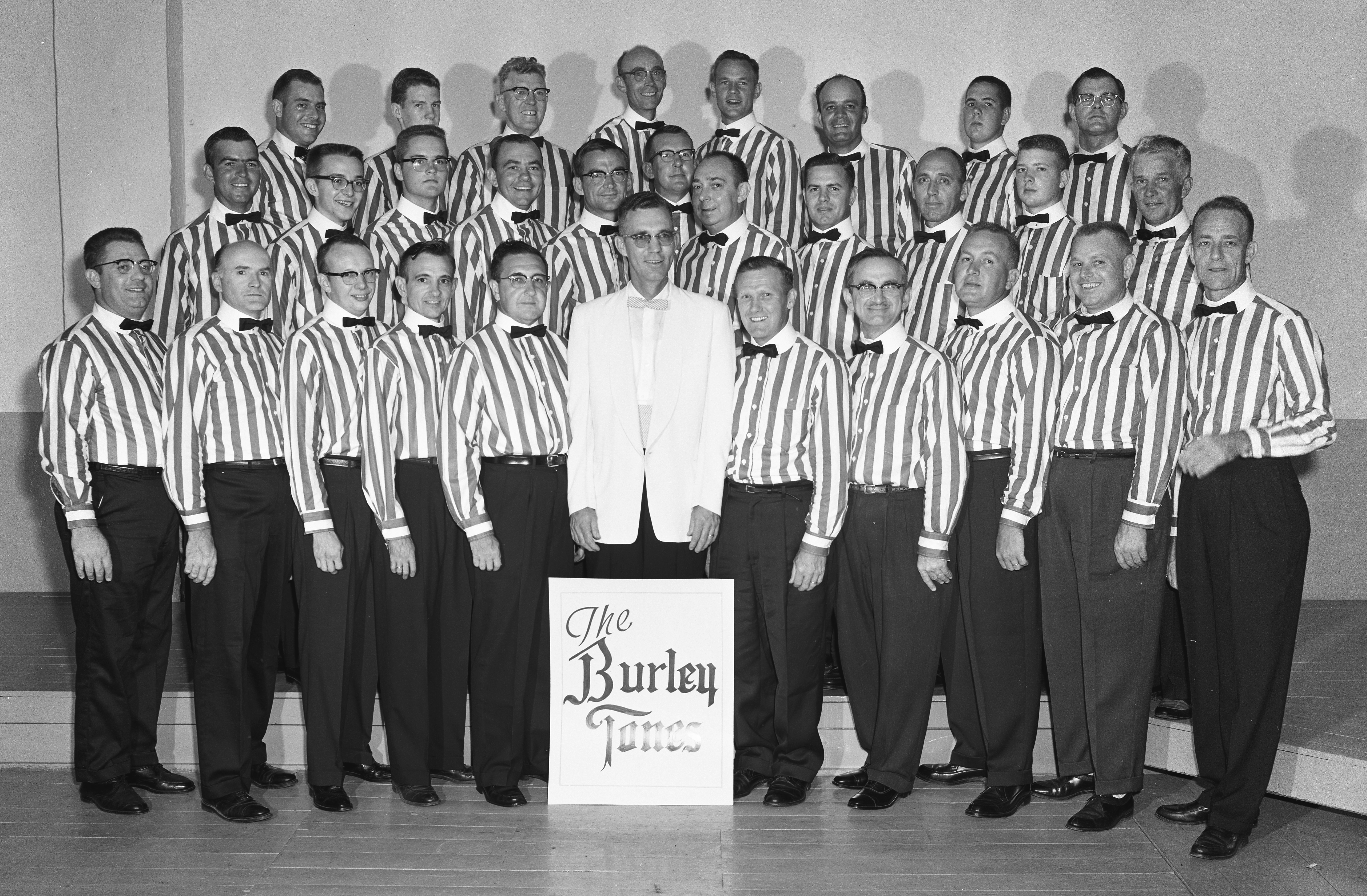 The singing Burley Tones included front row, left to right: Bob Ballard, Sid Wilson, Bill King, Benton Miller, Al Miller, Paul Husband, Director; Russell Hickman, Jimmie Stammerman, Bob Whitney, Paul Johnson, and Dean Ellis.; second row, left to right: Ernest Lyons, Joe Wise, Danny Wilson, Rebel Swigert, Dr. Rodney Whittaker, Jimmie Adams, Benny Lanter, Earl Sorrells, Jr., Guy Lea, Johnny Mathis, and Woody Mitchell. Third row, left to right: Paul LeCompte, Larry Ellis, Dr. K. E. Ellis, Bob Singleton, Ted Igleheart, Melvin Sams, Billy Connell, and Jack Roberts.