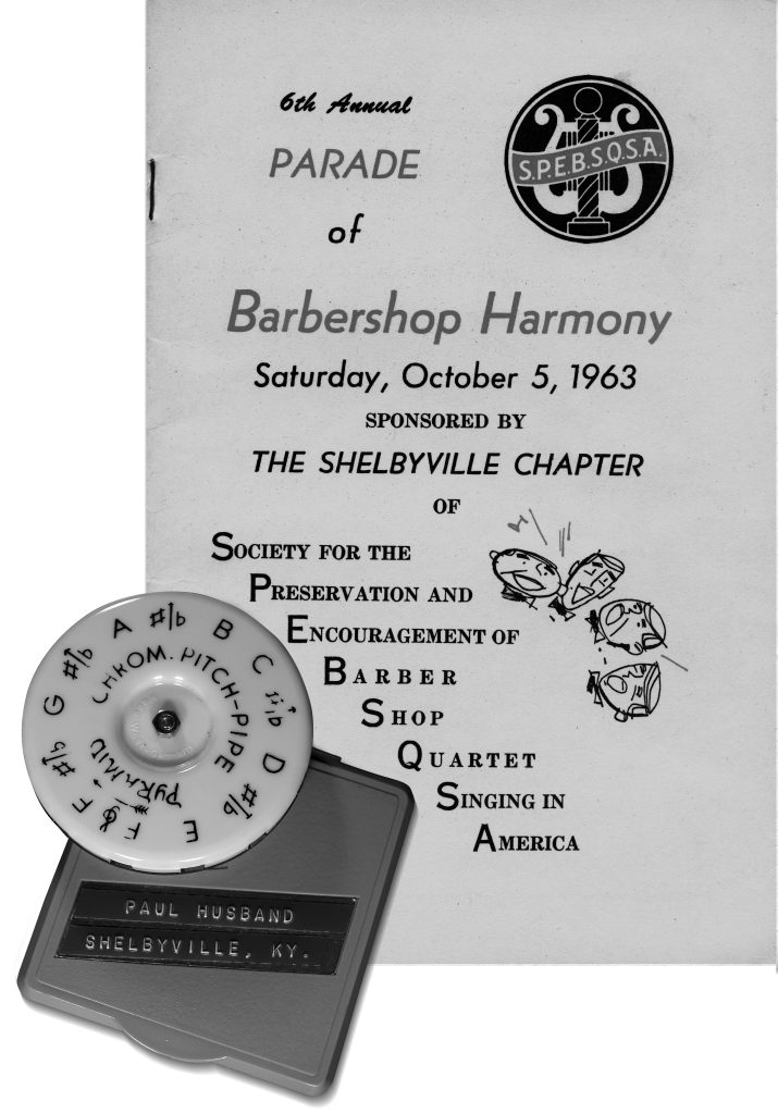 Pictured is the program for the 6th annual Parade of Barbershop Harmony that was sponsored by the Shelbyville Chapter of the Society for the Preservation and Encouragement of Barber Shop Quartet Singing in America (S.P.E.B.S.Q.S.A.). Also pictured is the Pyramid Chrom. pitch-pipe that Paul Husband used when he sang with The Burley Tones at that program.