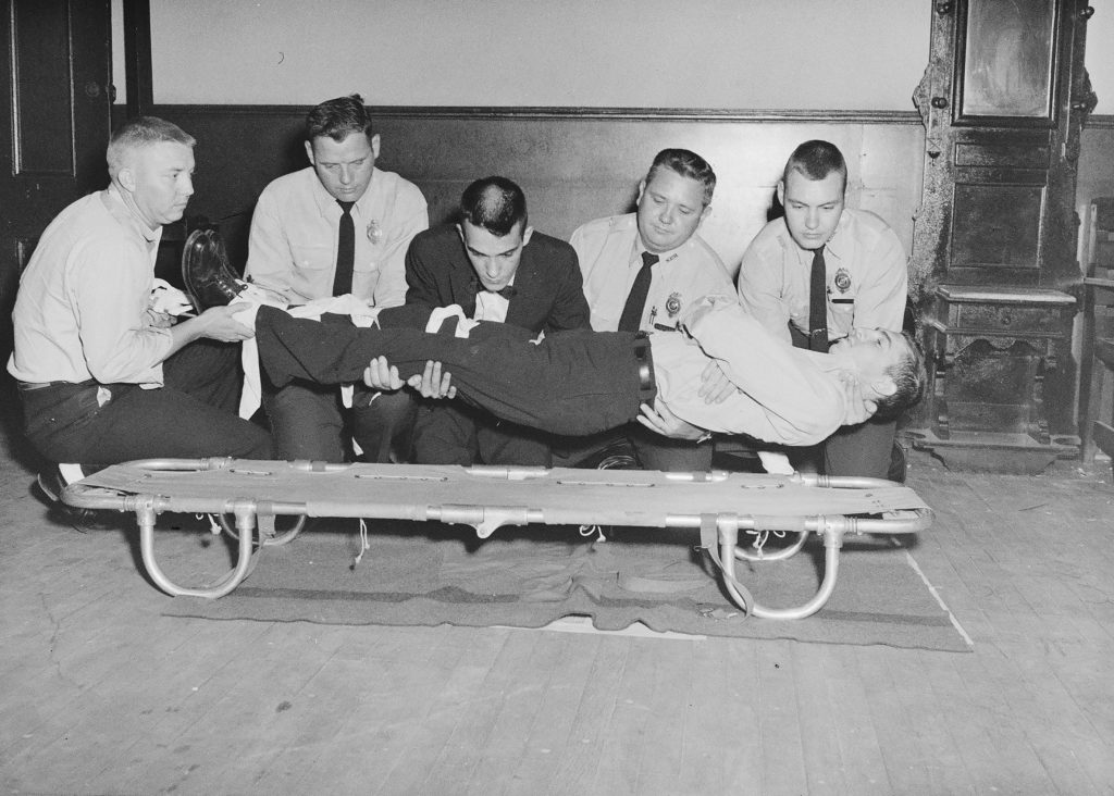 Group of firemen lifting an individual onto a medical stretcher. Stretcher drills help firemen stay attuned to possible emergencies.