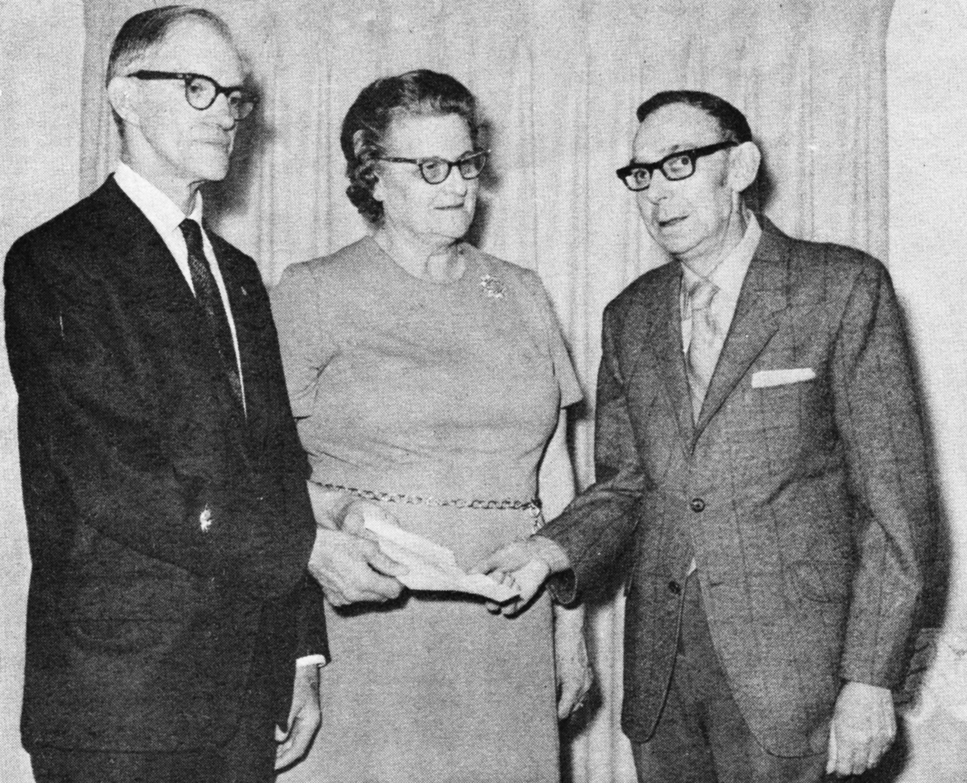 Mr. and Mrs. James Scofield were recognized for their services to the community in 1971. Benny Lanter, on the right, who ran a grocery for many years at the corner of 10th & College Streets, made the presentation.