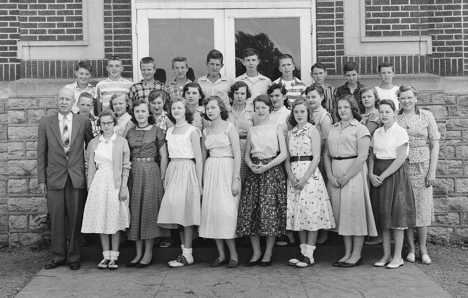 Prof. H. V. Temple, far left, and Mrs. Temple, far right, dedicated many years to the students of Henry Clay High School in the eastern end of the county. This is a class in 1955.