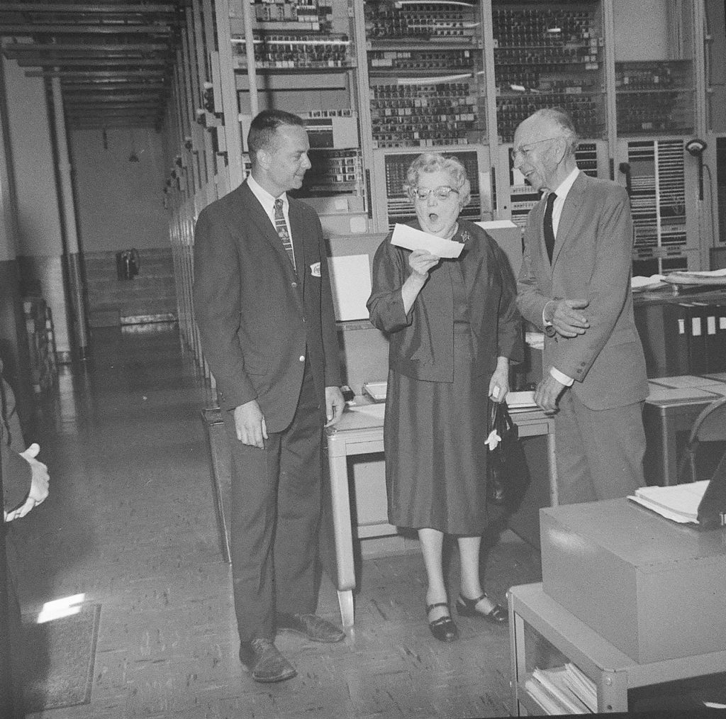 Photo of Mrs. Clara Cleveland (center) who received two checks, one from Mr. Cal Schmidt, on the left, and one from Mr. Richard Randolph, on the right, for being the one millionth caller since the “Time-of-Day” service began in 1962.