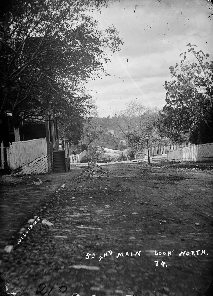 5th and Main Streets, looking north in 1874. Photo taken by John Wesley Williams.