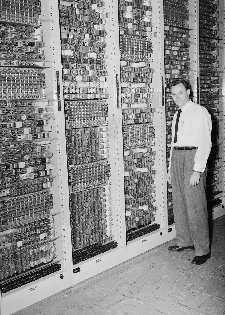 Photo of unidentified individual in front of telephone switching equipment.