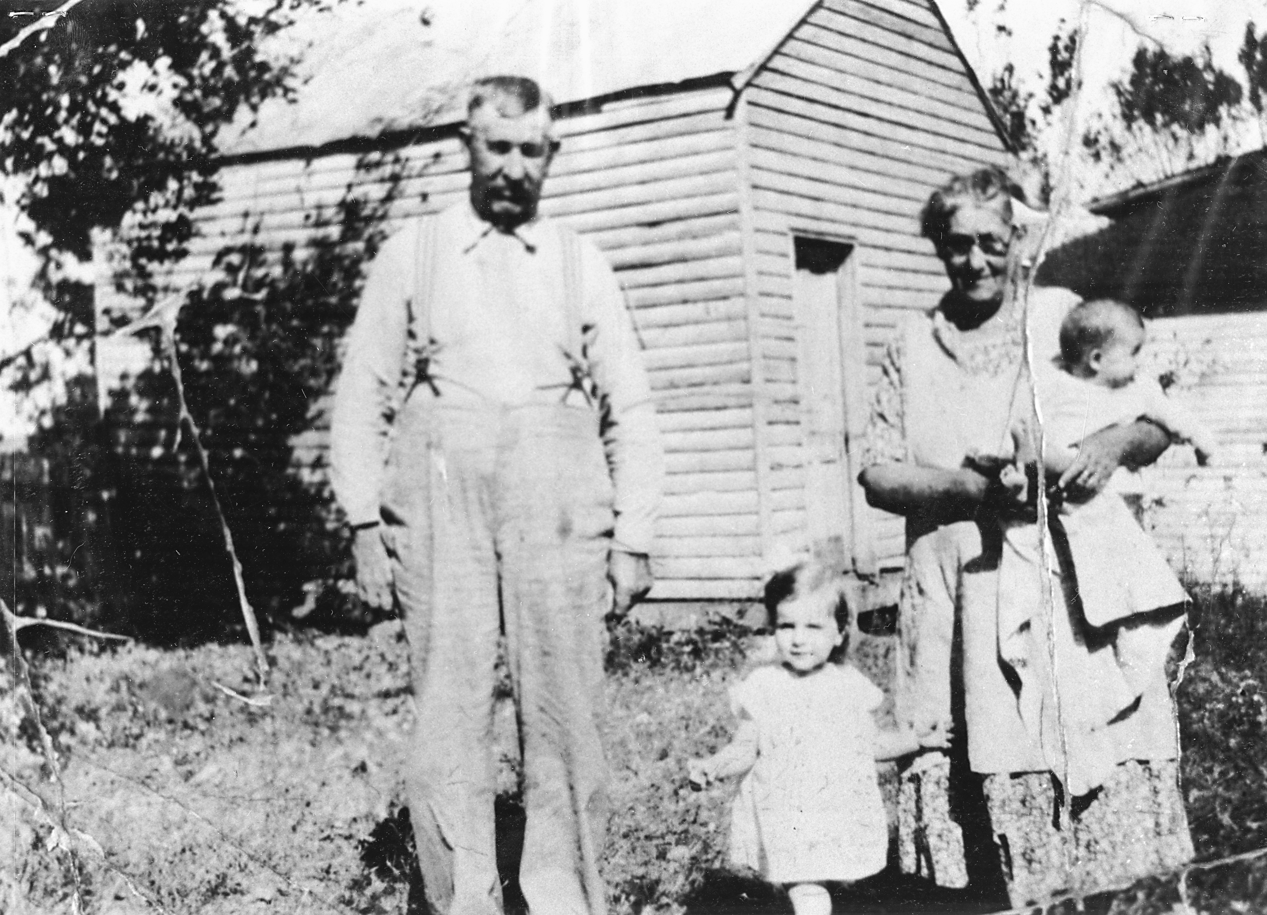 The Harrisonville Post Office in 1933 was located in the front yard of Dell and Sue Cook, who also staffed it. The post office was torn down in the early 1930s. Pictured here are Dell and Sue Cook with two of their children, Margaret Ann and Bettie Sue Cook.