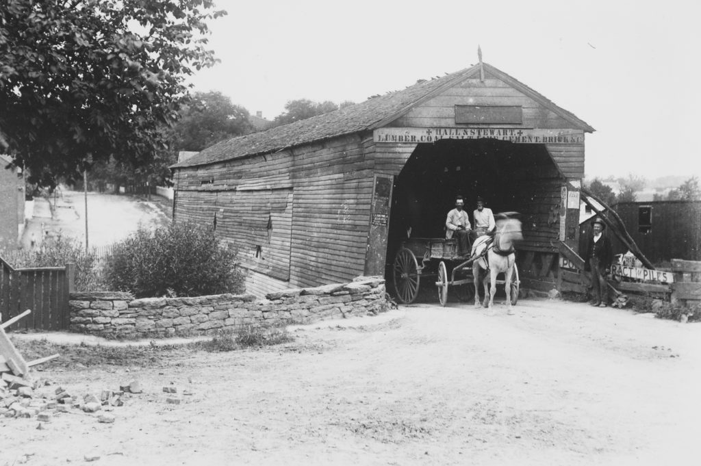 Sign over entrance to bridge: “Hall & Stewart; Lumber, coal, [salt], [lime], cement, brick & C.”