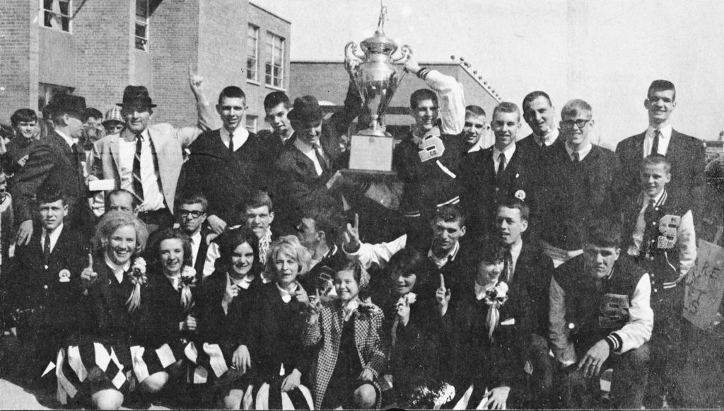 Shelby County High School’s Kentucky State High School Basketball Tournament team, cheerleaders, and fans celebrate their championship win over Louisville’s Male High basketball team.