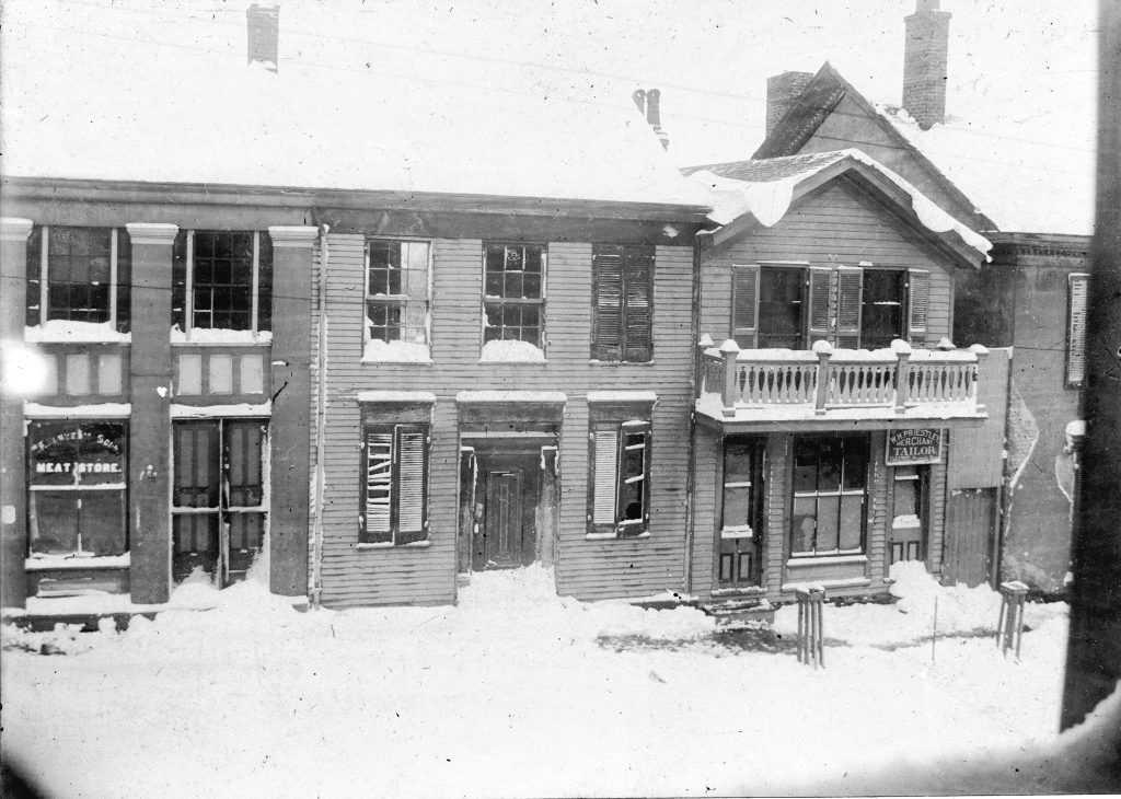 The building on the left was a meat store at street level. On the second floor there was a photography studio, the building in the center was Travis Wilson’s saddle shop with his residence adjoining and Priestley’s Tailor shop was on the right. These buildings were on the north side of Main Street between 4th and 5th Streets next to the town square. Later, the building would become the store of John M. Casey.