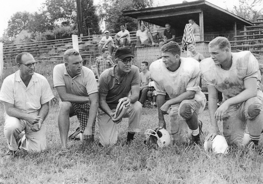Legendary Shelbyville High School Coach Richard “Puss” Greenwell is flanked, left, by assistant coaches Allie Kays and Johnny Buckner, and, right, by two of his players, Morty Webb Jr. and Bob Cottingim. Unidentified individuals pictured behind them.