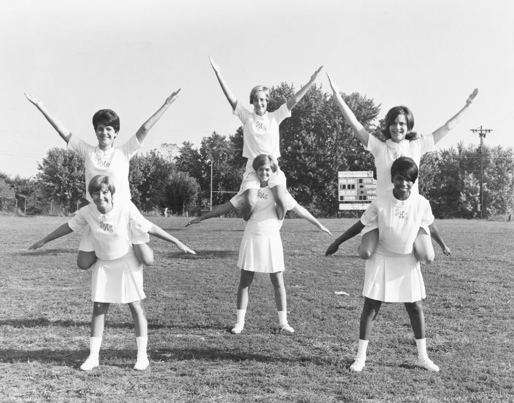 Shelbyville High School cheerleaders included, first couple Debbie Cubert and Lyn Sandidge, second couple Lucy Buckner, Lydia Hundley, and third couple, Anita Payne, and Cheryl Clarke.