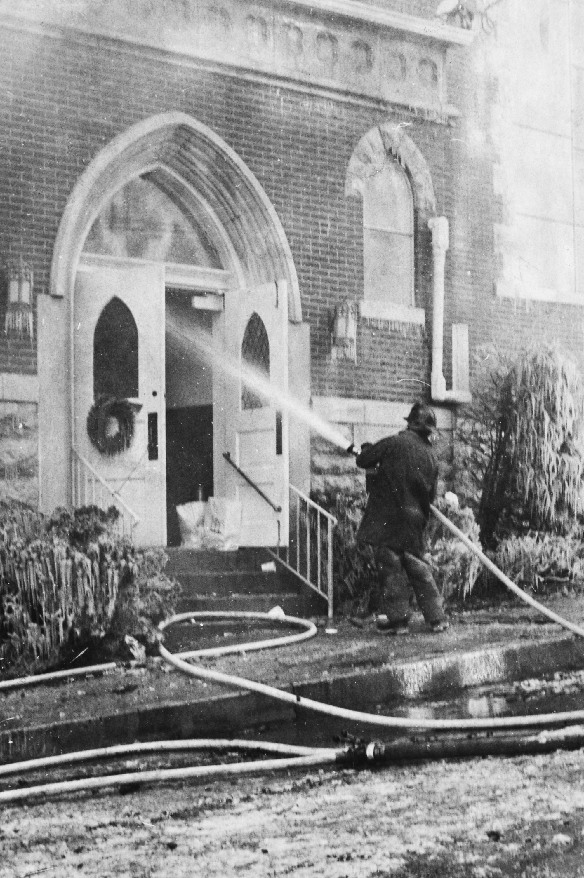 Pictured is a fireman working to put out the fire at the Centenary United Methodist Church in 1978. The church could not be saved.
