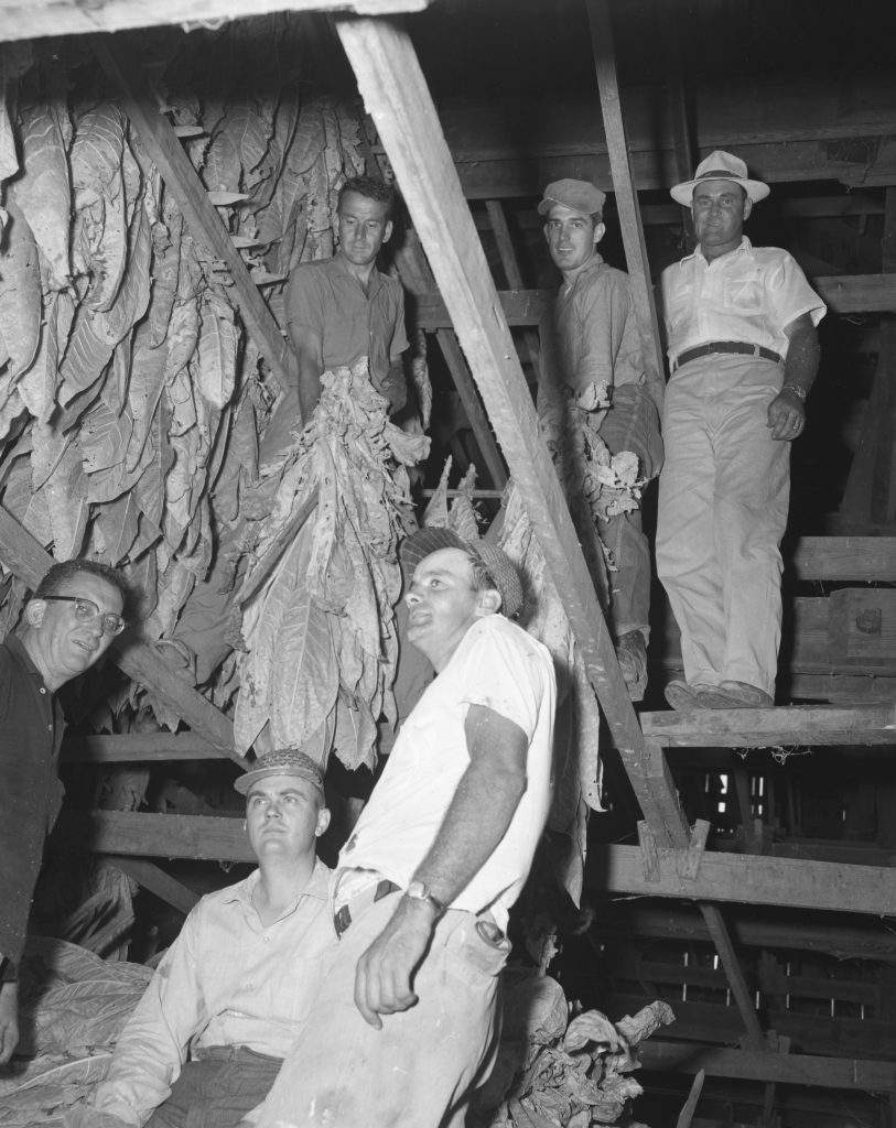 The Shelbyville Kiwanis Club harvested a small crop of tobacco as a fund-raising venture in the 1950s. In the front, left to right, are Lynn Miller, Clarence Catlett, and Melvin Sams Jr., back, left, Jesse Puckett.