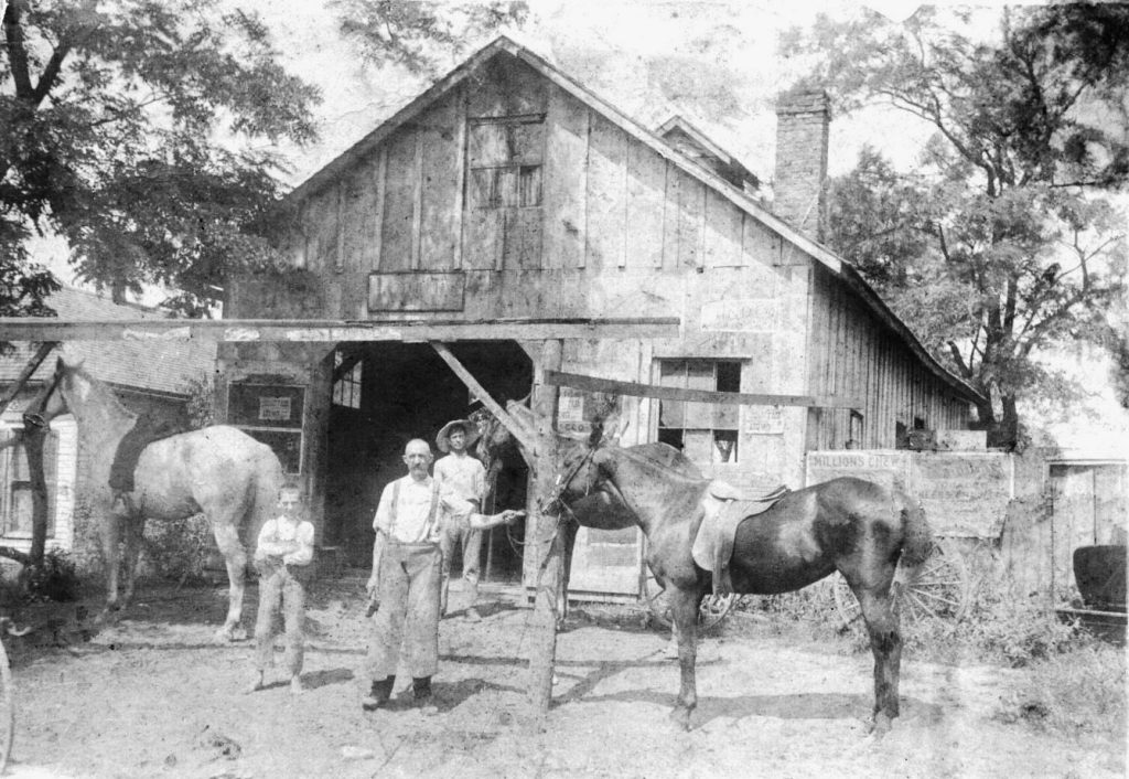 George Thomas Bowles, Lee Bowles, and Tevis Stone stand in front of this blacksmith shop in Finchville in 1910.
