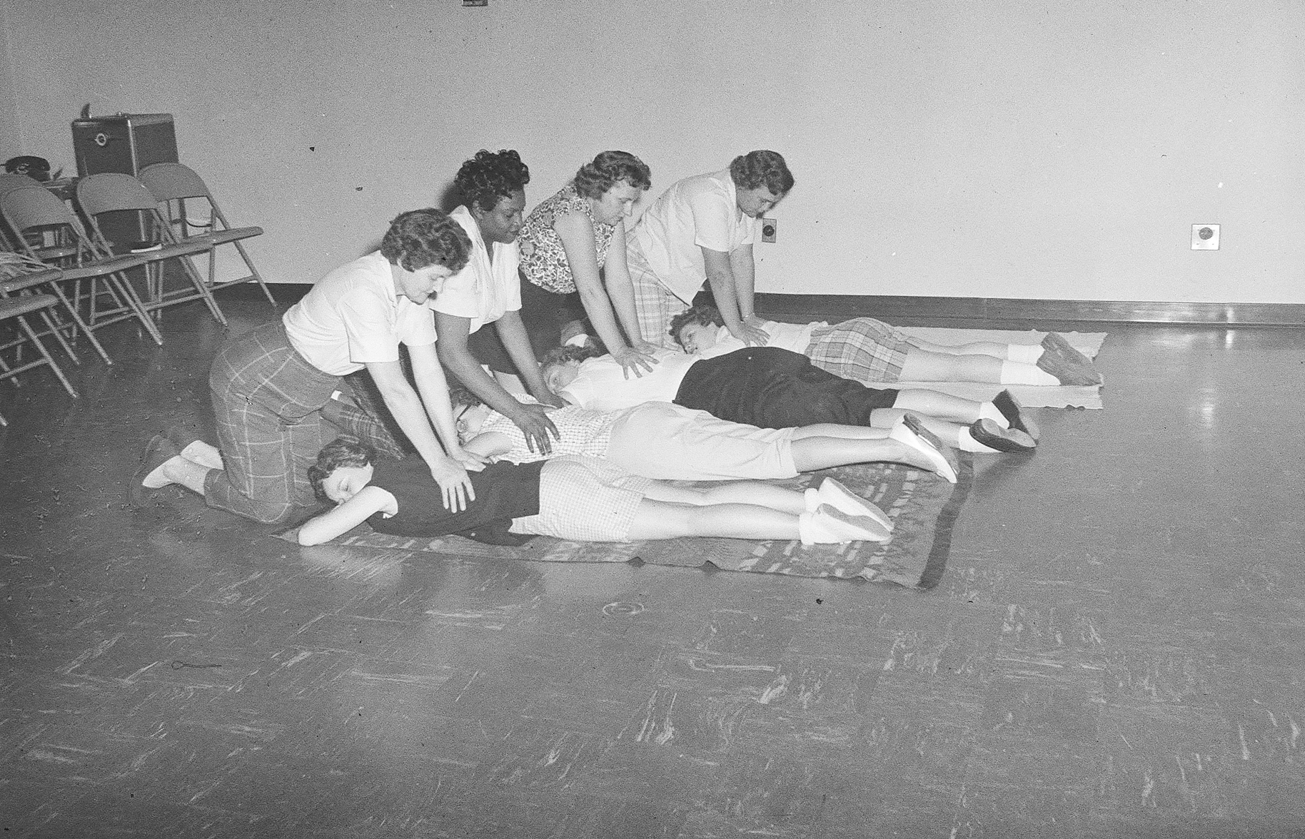 Eight unidentified individuals practicing a Civil Defense Drill, specifically the Back-Pressure Arm-Lift Artificial Respiration method