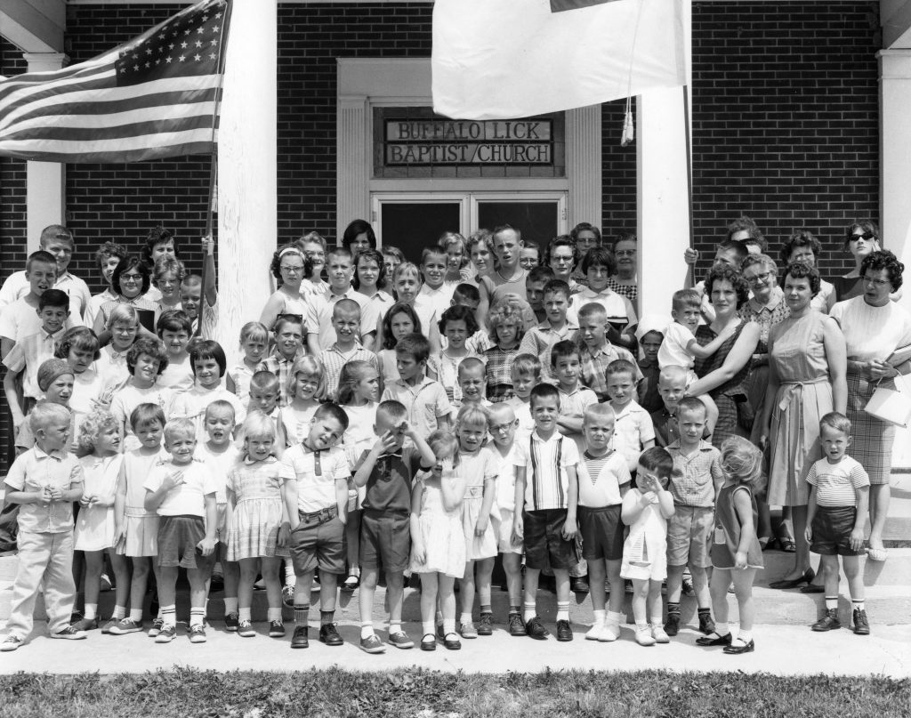 Group outside of the Buffalo Lick Baptist Church, possibly taken in the Spring or Summer.