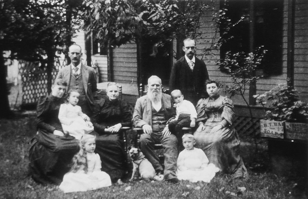 In 1892, the Gruber family, famous for many of the buildings that still grace Shelby County, gathered at their home on East Main Street. At the left is Lynn Thomas Gruber, his wife Mamye Deets, with daughters Bertie and Grace (seated in front); at right is Henry Calvin Gruber, wife Mettie Davis and children John Lewis and Helen Kate. Seated in the center are Lucy Catherine Dear and Lewis Henry Gruber.
