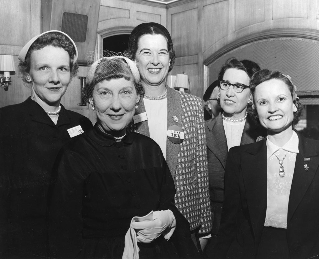 Mrs. Craig (Betsy) R. Schmidt, far left, was among those who greeted Mrs. Dwight (Mamie) D. Eisenhower, second from the left, when she came to Kentucky, as part of Dwight D. Eisenhower’s 1952 whistle stop train tour. Others on the left after Mamie Eisenhower, include Mrs. Allen Carrell, Jeffersontown, G. O. P., Mrs. Stanley Pace, Burkesville, national committeewoman and an unidentified woman.
