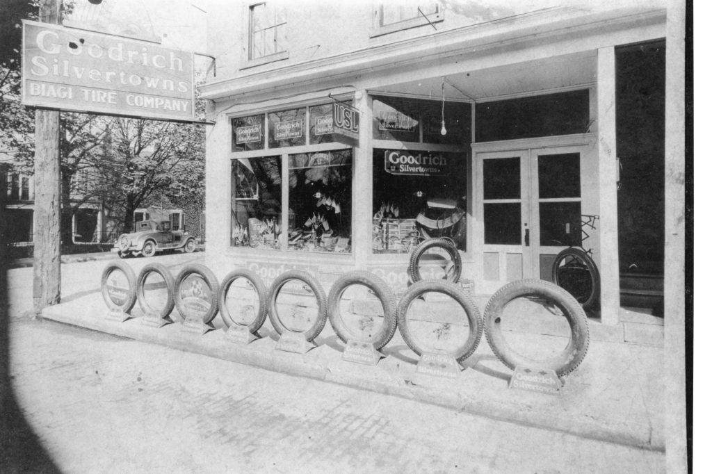 Photo of the Biagi Tire Company at the corner of 6th and Washington Streets. A tire brand that they sold there was the Goodrich Silvertowns.