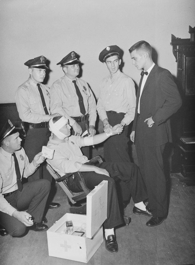 Firefighters and police officers listen to an instructor regarding first aid techniques.