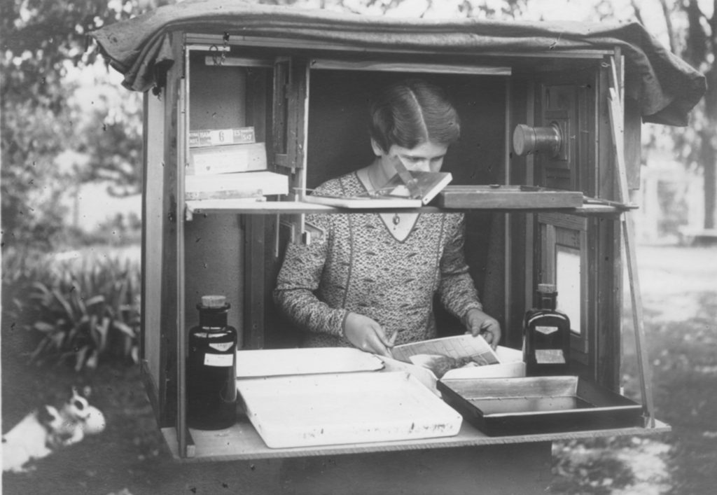 Peggy Williams Miller photographed here in her uncle Otho Williams portable dark room.