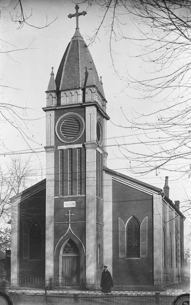 Photo of individual outside of the Church of the Annunciation. The church was built in 1860.