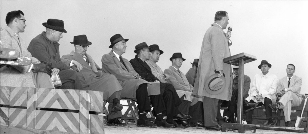 Photo of Governor A. B. “Happy” Chandler (standing) at the dedication ceremony for Chandler Lake.