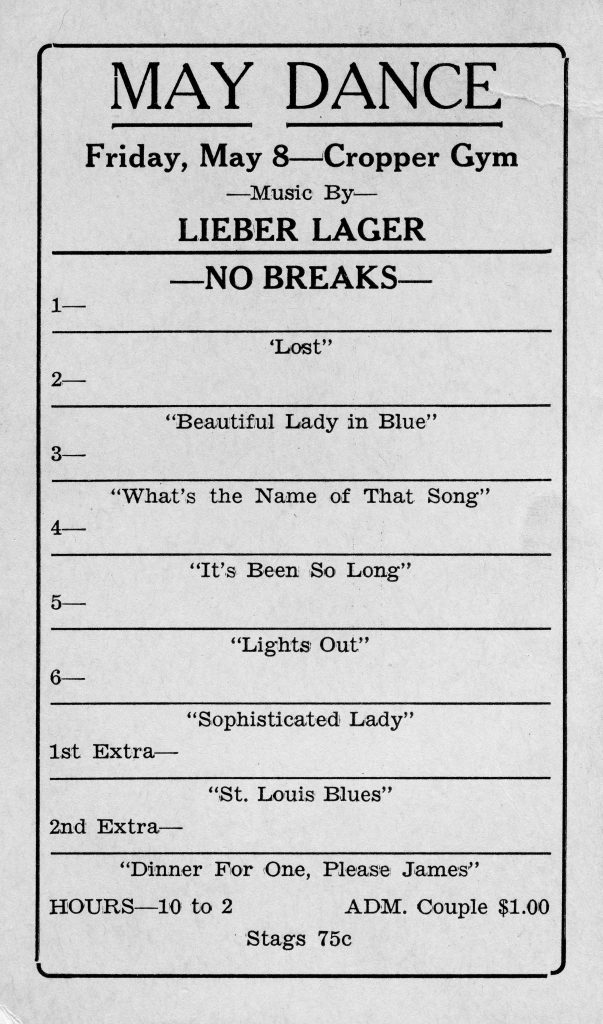 Hosted on May 8, admission was only $1.00 for couples and 75 cents for “stags” when Lieber Lager provided the music for a dance at the Cropper Gym.