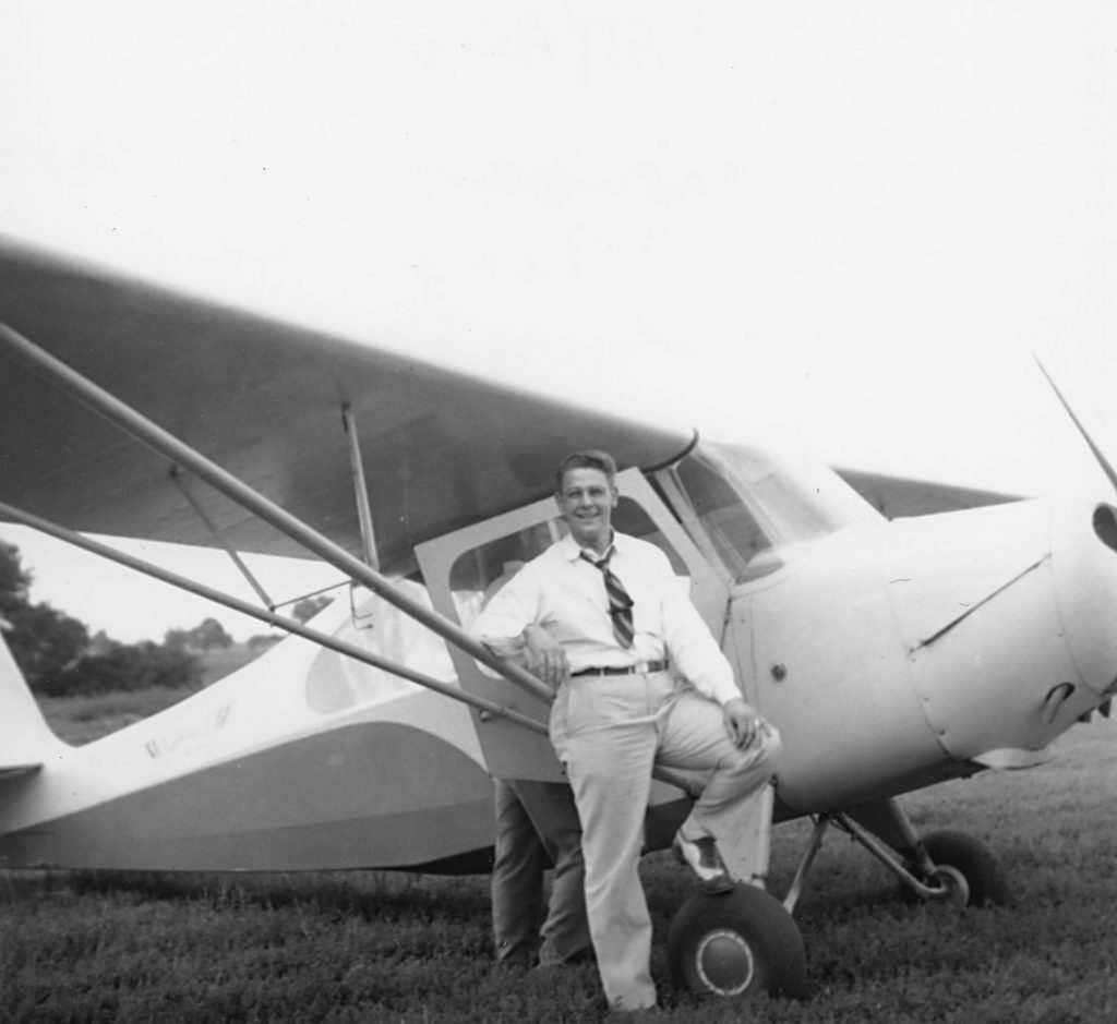 Bill Shannon, one of the early proponents of the Shelbyville airport, stands near an Aeronca airplane operated by Scharton Flying Service.