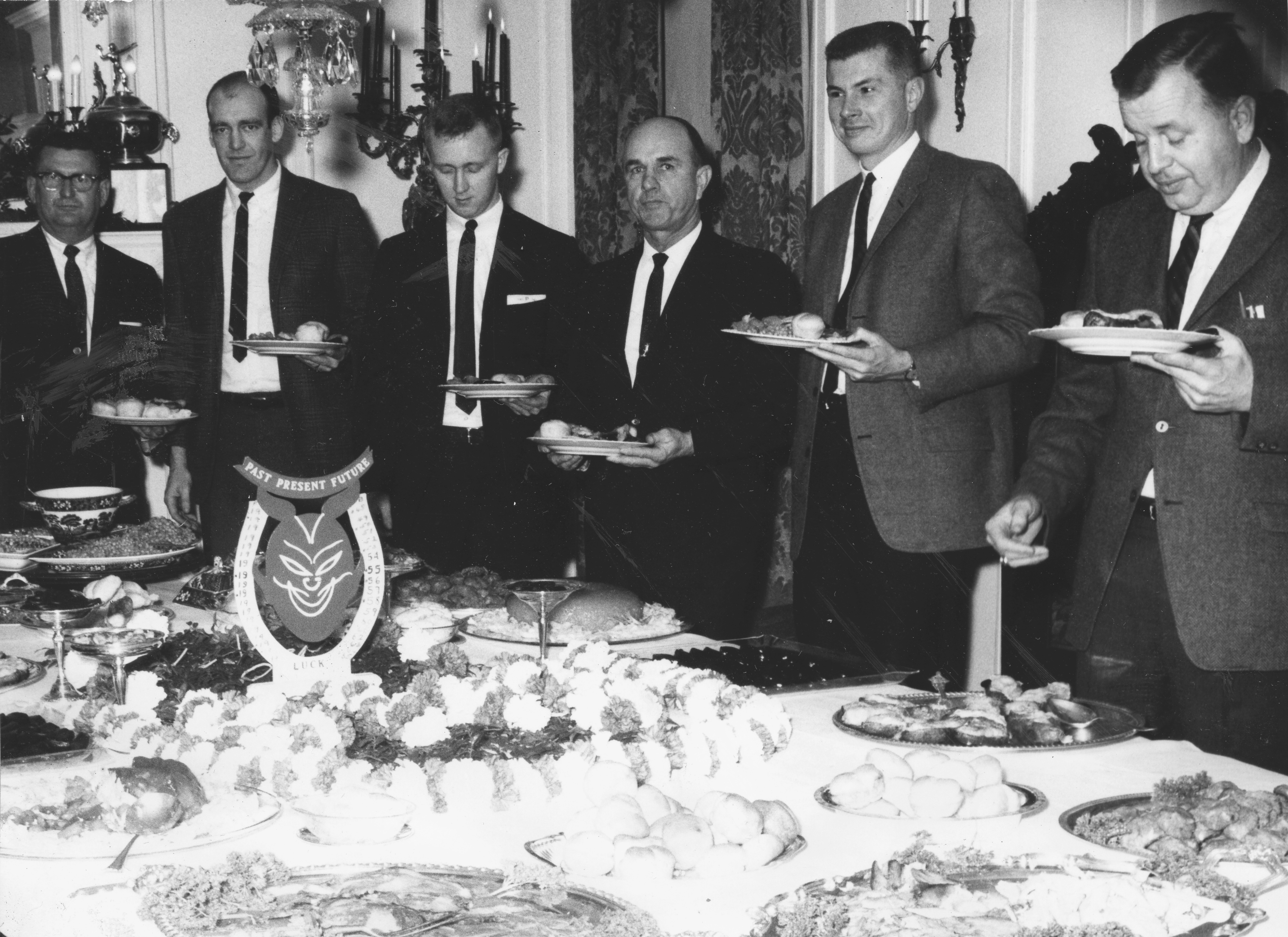 Pictured are school board member Bobby Stratton, Dennis Giles, Steve Pumphrey, head basketball coach Evan Settle, Rev. Fred Moffatt, and Superintendent William/Bill McKay at the buffet table.
