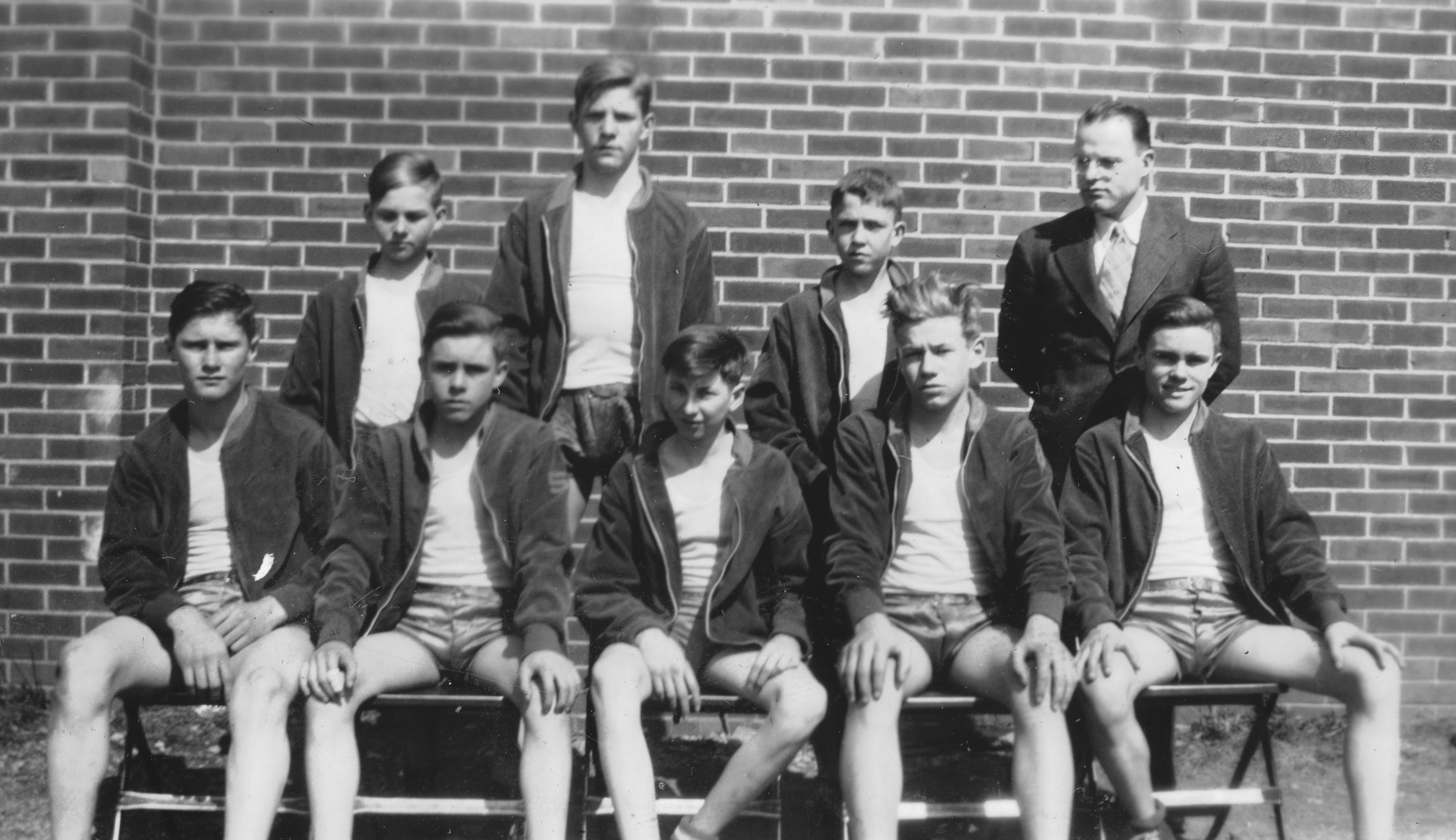Bagdad Junior High School Basketball team included left to right, front row, Melvin Smither, Kenneth Ashby, “Peck” Poole, Jimmy Merchant and Bobby Ashby; back row, Billy Davis, Jack Vanarsdale, Melvin Harrod, and Coach Burnett.