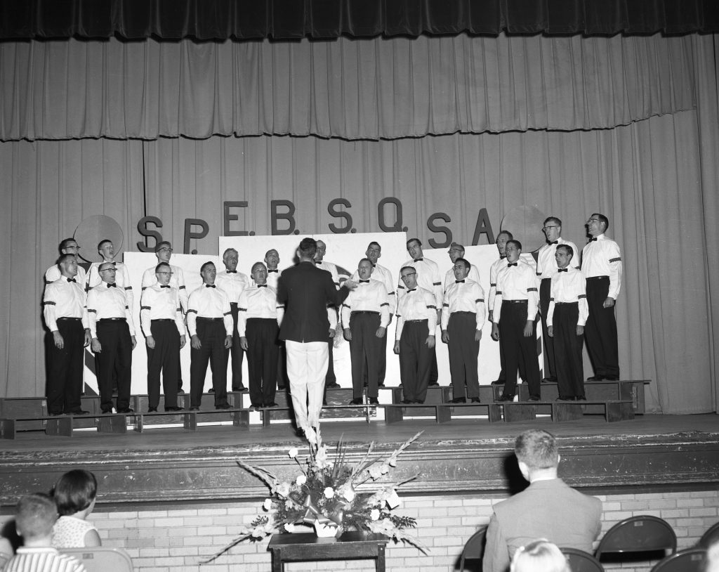 Barbershop singers performing their introductory concert as the Society for the Preservation and Encouragement of Barber Shop Quartet Singing in America or S.P.E.B.S.Q.S.A. The group performed on August 29, 1958 at the Shelbyville High School gym.
