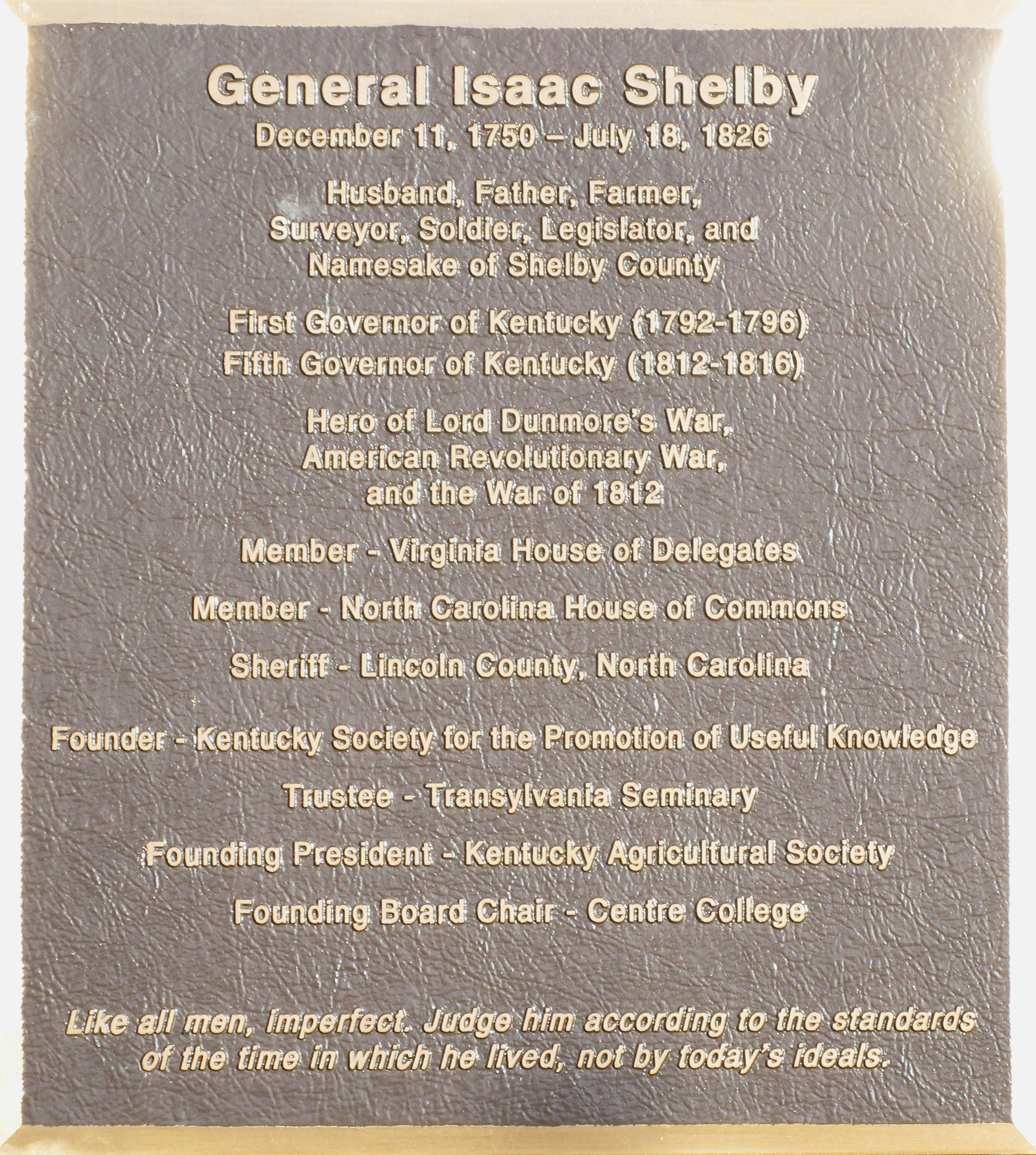 Shelby had served in Virginia’s House of Delegates in 1779 and was elected to North Carolina’s General Assembly in 1781 and again in 1782. Following the conclusion of the Revolutionary War, Shelby relocated to the “new west”, or Kentucky, in April 1783 on lands awarded to him for his military service. He settled in Boonesborough and married Susannah Hart, a union that produced eleven children.